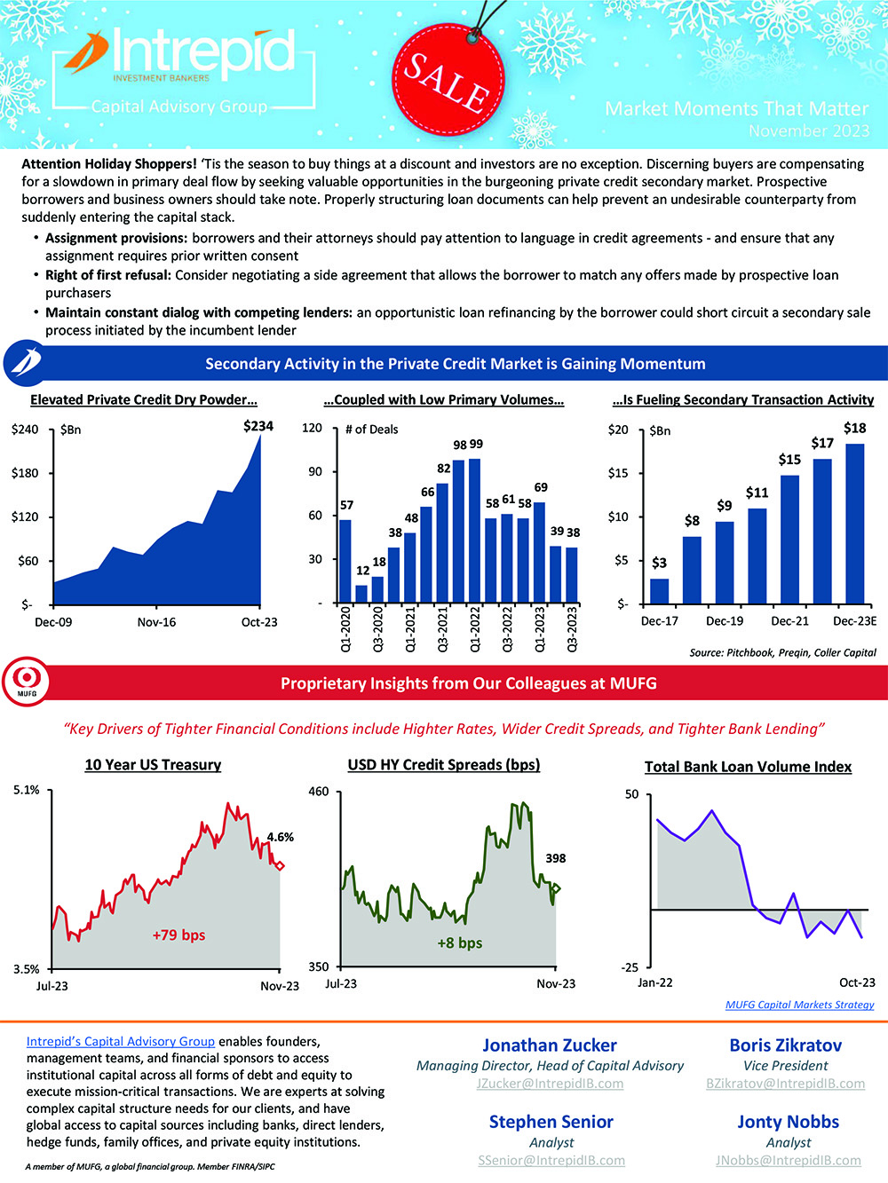 As bargain shoppers seek discounts this holiday season, investors are doing the same in the secondary market. Read more in our latest monthly update below and click here to access the full PDF.