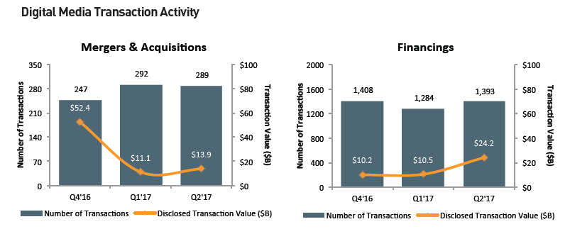 M&A and financings exhibited robust activity in Q2’17, with nearly 290 M&A transactions and more than 1,390 disclosed global financings. Key industry trends driving investments and acquisitions include: